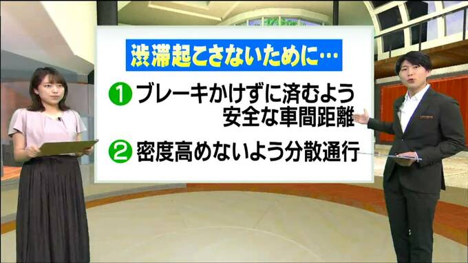 「安全な車間距離」を保つことが同時に渋滞を起こしにくくすると言えそうです。ただ、車間距離をあけ過ぎると、今度は車の割り込みなどが頻繁におきて危険が増すとも言われています。一方、そもそも交通量が増えて密度が高くなると、車間距離が短くなりブレーキをかけやすい状況となってしまいます。ネクスコ東日本は、渋滞の予想時間帯を避けるなど「分散通行」を呼びかけています。