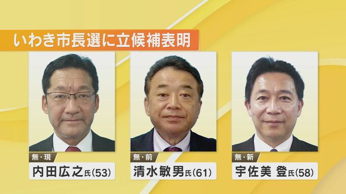 これまでにいわき市長選挙に立候補を表明しているのは、現職で2期目を目指す内田広之さんと前の市長の清水敏男さん、それに元衆議院議員の宇佐美登さんの3人で、選挙戦となる見通しです。