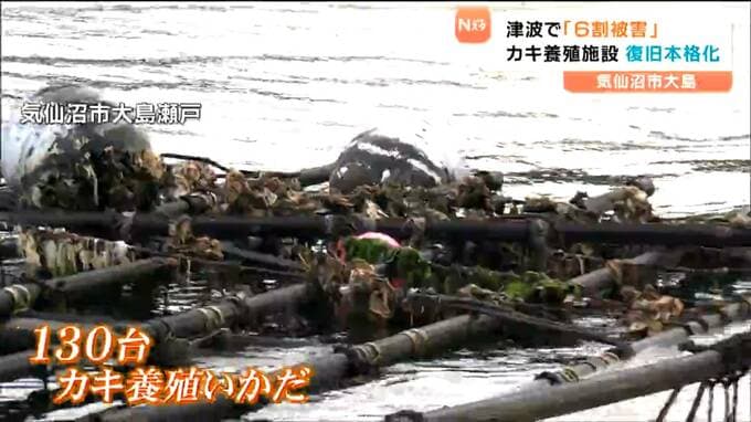 気仙沼市大島の海上では、先月30日の津波で被災したカキの養殖施設の復旧作業が本格化しています。半数以上の施設が被害を受けていると見られ養殖業者からは落胆の声が聞かれました。気仙沼市大島瀬戸では3軒の養…