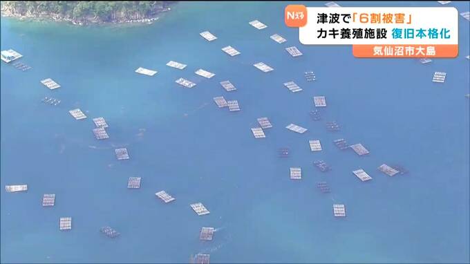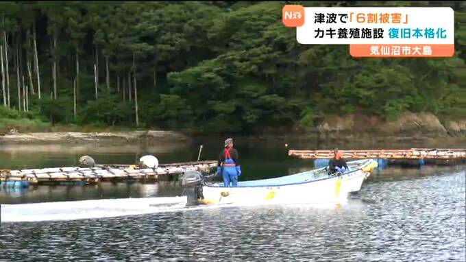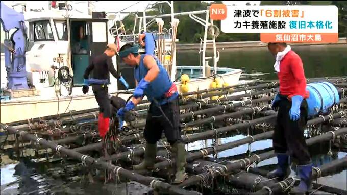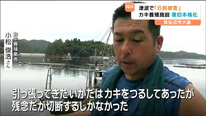 気仙沼市大島の海上では、先月30日の津波で被災したカキの養殖施設の復旧作業が本格化しています。半数以上の施設が被害を受けていると見られ養殖業者からは落胆の声が聞かれました。