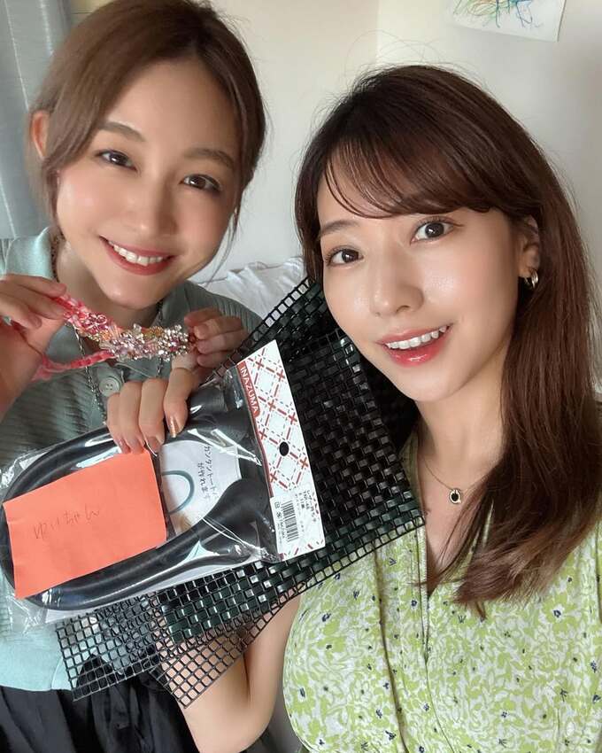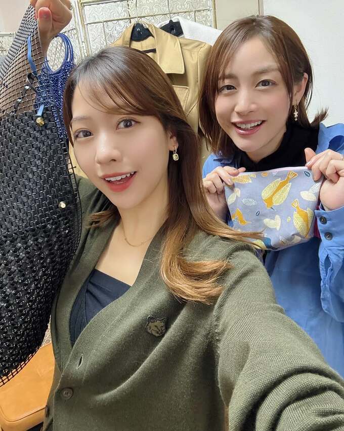 写真には新井恵理那さんと小野寺結衣さんが室内で親しげに並ぶ姿が写っています。緑色の服を着た小野寺さんがパッケージを持ち、新井さんは紅色の小物を手にしています。明るく温かな雰囲気の中で二人が楽しそうに過ごしている様子が伝わってきます。