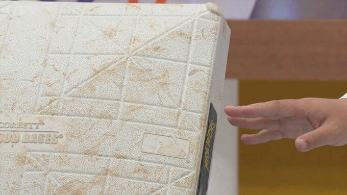 盗塁を決めたということは、この角のあたりでしょうか、大谷選手のスパイクの跡かもしれません。グランドの土も残っていて、触れるだけでも試合の興奮が伝わってくるようです。