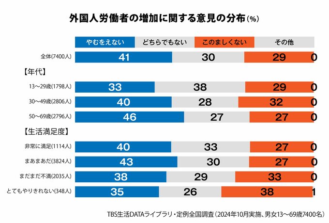 また、就職氷河期世代と言われる40代を含む壮年層は、外国人であれ職を争う競争相手が増えることに警戒感を抱いて危惧派が多いのかも。