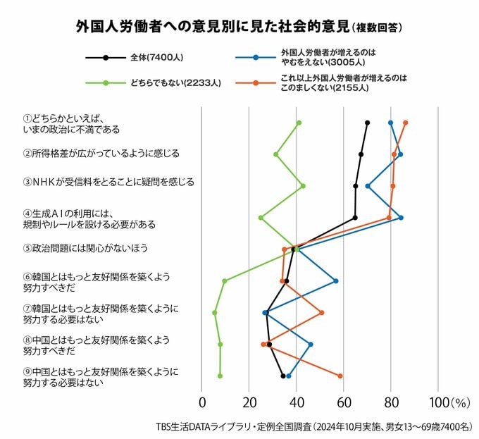 昨年(24年)10月の調査データを分析してきましたが、外国人労働者増加を問題視する見方は現状への不満と関係がありそうだ、というのは、今回の参院選の結果にも通じていそうな話です。