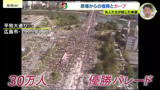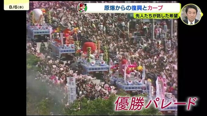 県民、市民とカープの関係がよく伝わってくるのが初優勝を祝うパレードです。平和大通りで催された優勝パレードにはおよそ30万人がつめかけたといいます。
