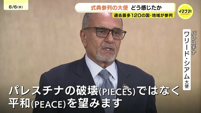 市はことしの式典で、これまでの「招待」から、全ての国と地域に開催を知らせる「通知」を送る方法に変更。参列国は、過去最多の120の国と地域になりました。今回初めて参列を決めたパレスチナの大使が取材に応じました。