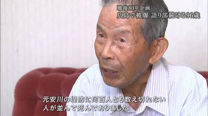 「元安川の堤防に何百人とも数えきれない亡くなった人が並んで死んでおりました。みんなお相撲さんのように太ってやけどして衣類が焼けていますから裸なんです。川の堤防に何百という数えきれない人が並んで亡くなっている姿を車の上から見ました。これは大変なことだと思いました」