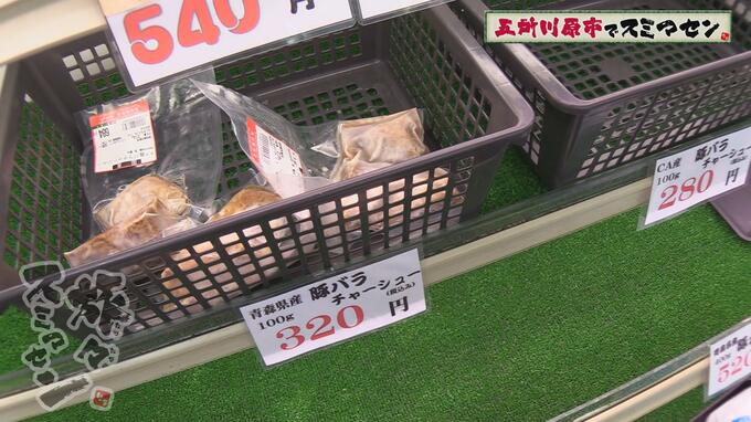店のショーケースには、豚ロースや豚バラ、牛バラなど様々な製品が並んでいます。