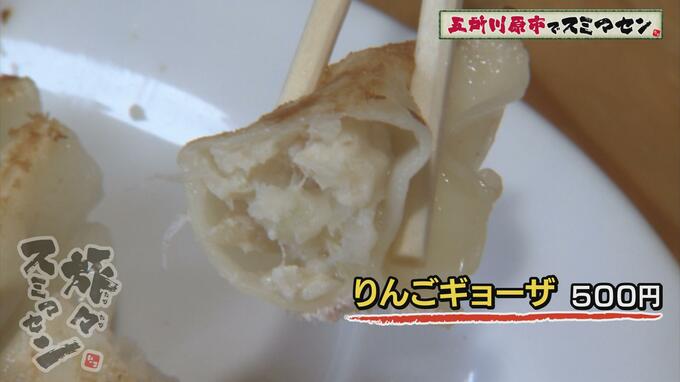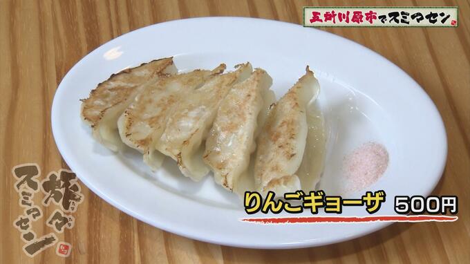 追加で『りんごギョーザ』も注文。ピンク色の塩につけていただくと、リンゴの甘酸っぱい味が口に広がります。