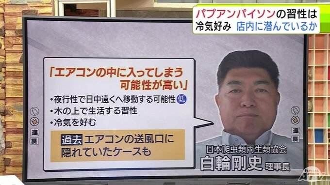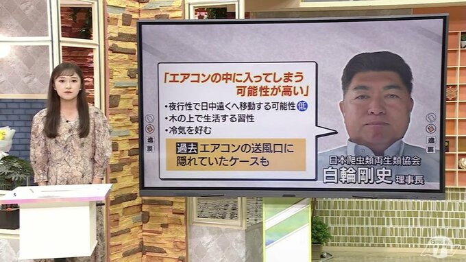 また、白輪 理事長は、「エアコンの中に入ってしまう可能性が高い」と言います。夜行性で日中、遠くへ移動する可能性は低いと指摘し、主に木の上で生活する習性と冷気を好むことから、ヘビが隠れていそうな場所が推測できるとしています。