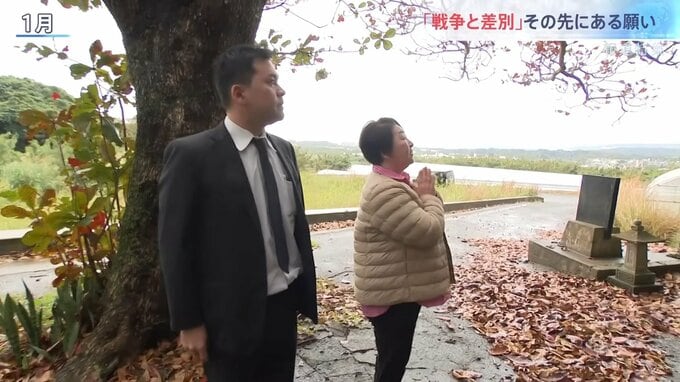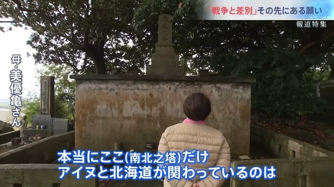 釧路市出身のアイヌで、20代の頃から沖縄に暮らす玉城美優亀さんと、長男の寿明さん。南北之塔の意味を伝え残したいと考えている。
