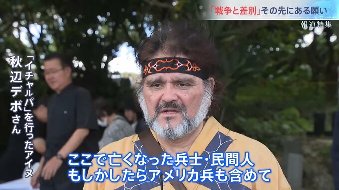 そして6月23日、「沖縄 戦没者慰霊の日」。玉城さん親子の働きかけが実った。戦後80年の節目に6人のアイヌたちが儀式を行うため20年ぶりに南北之塔を訪れた。アイヌたちは木を削って作った神へのささげ物、「イナウ」を使って祈るのが伝統だ。
