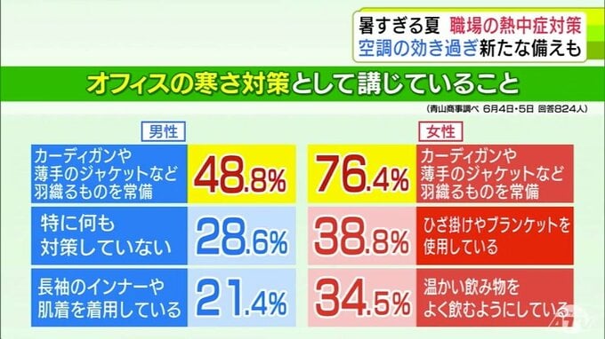 また、夏でもカーディガンなど羽織るものを常に用意している人が男性48.8%に対して、女性は76.4%と高い数字となりました。体感はそれぞれ違うため働いている人も工夫をしているようです。