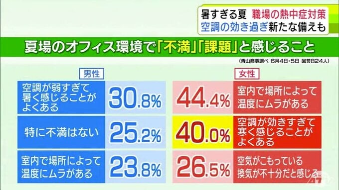 この紳士服店が全国824人のビジネスパーソンに行った意識調査では、夏場の職場環境で女性の4割が空調の効き過ぎで寒さを感じていることがわかりました。