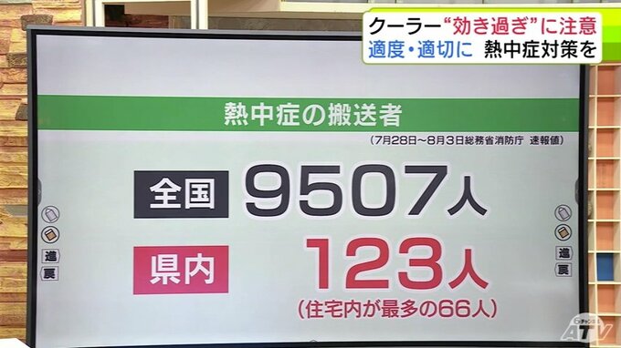 総務省消防庁によりますと、先週7月28日~8月3日までに全国で熱中症によって搬送された人は9507人に上ります。このうち青森県内は123人、住宅内が最多の66人となっています。