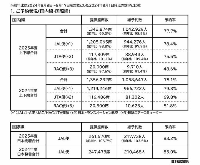 日本航空は、お盆期間(8月8日~17日)のグループ航空会社の予約状況をまとめました。(1日時点)