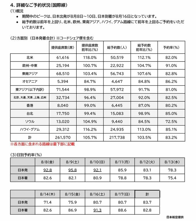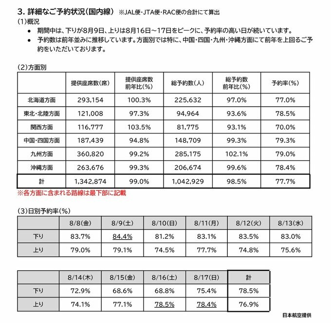 【お盆・飛行機(JAL)予約状況】国内線では下りは9日、上りは16~17日がピーク!中国・四国・九州・沖縄方面で前年上回る予約状況 テレビ山口 2025年8月7日(木) 12:03 国内 詳細な予約状況