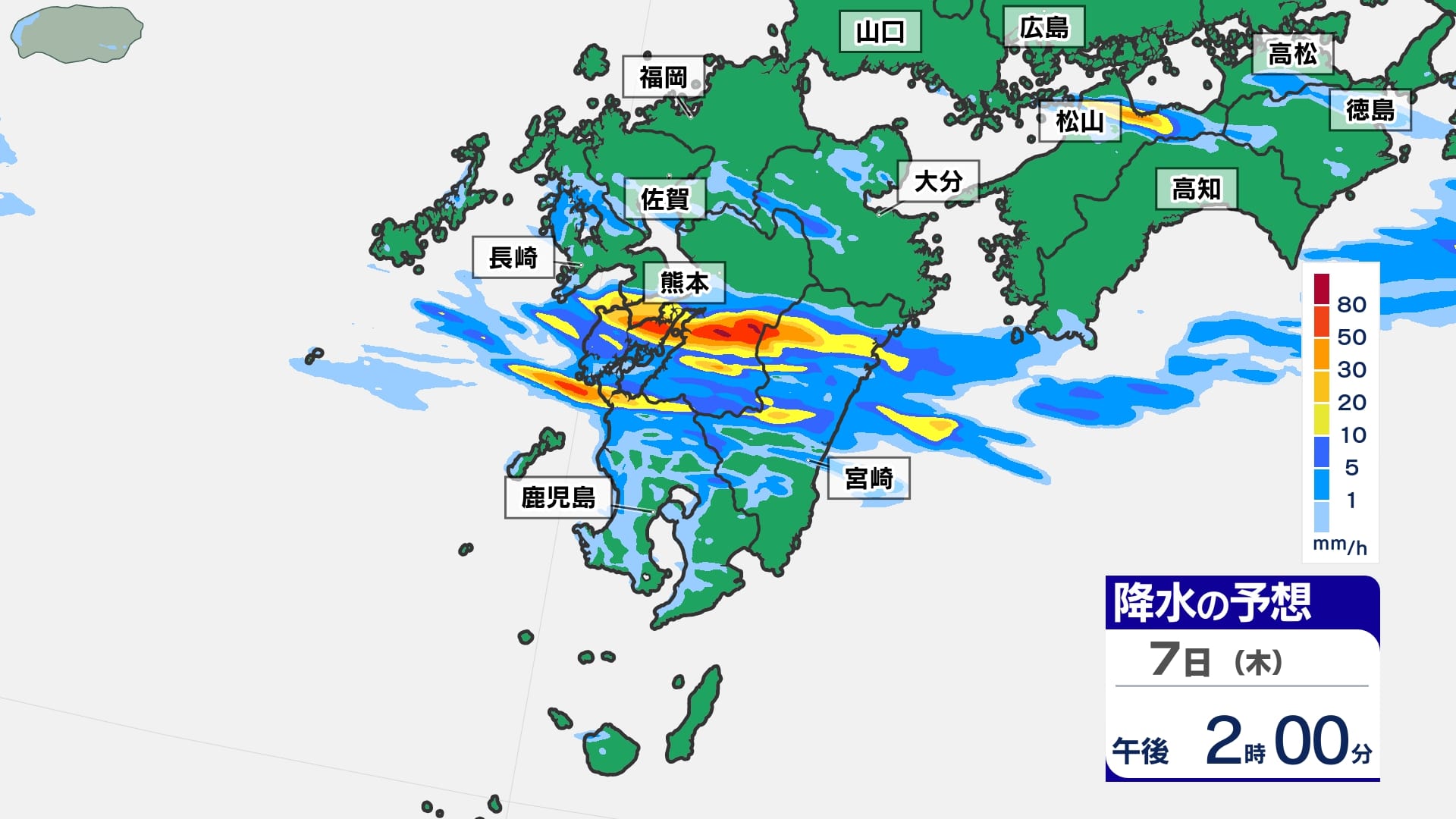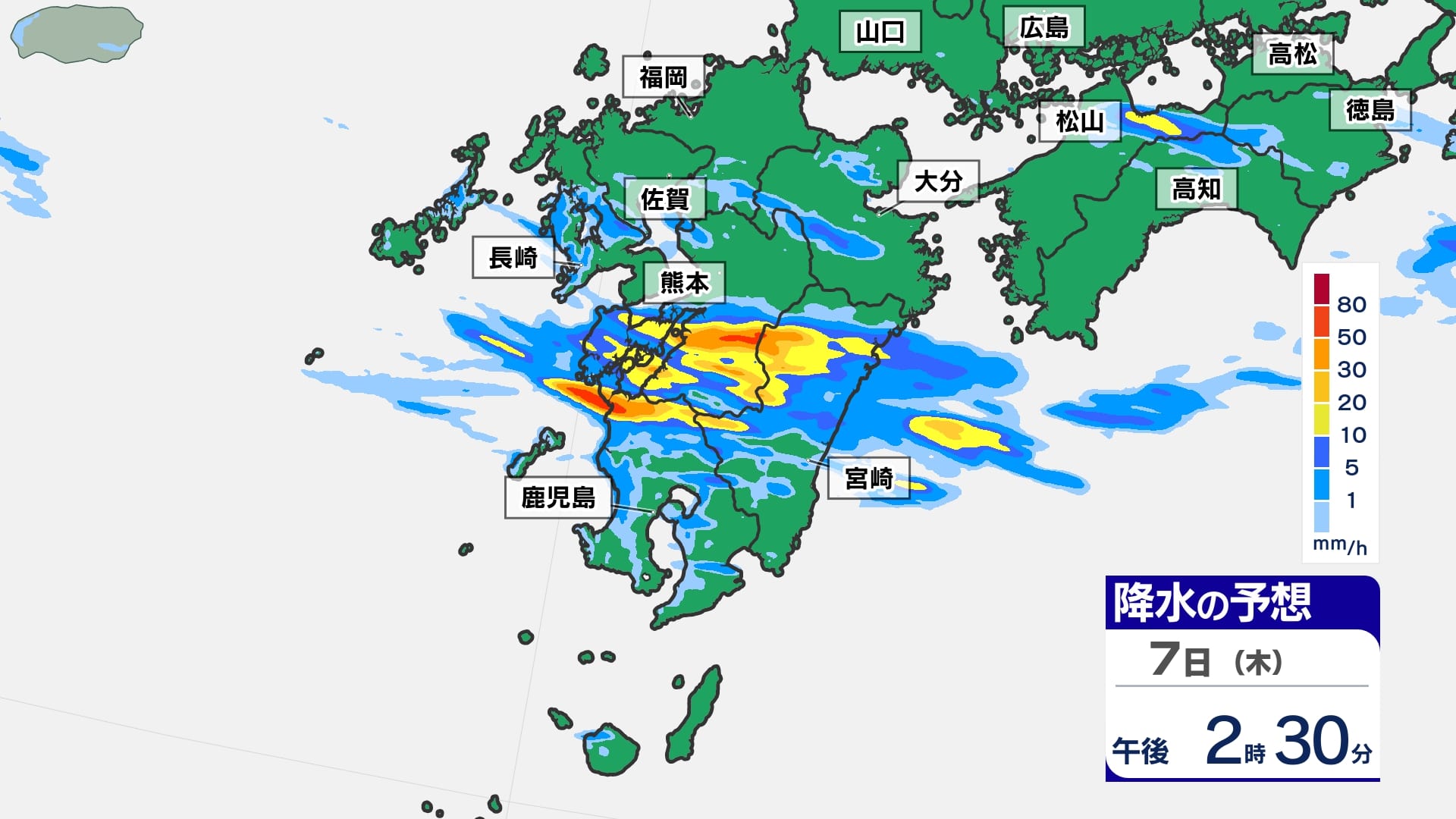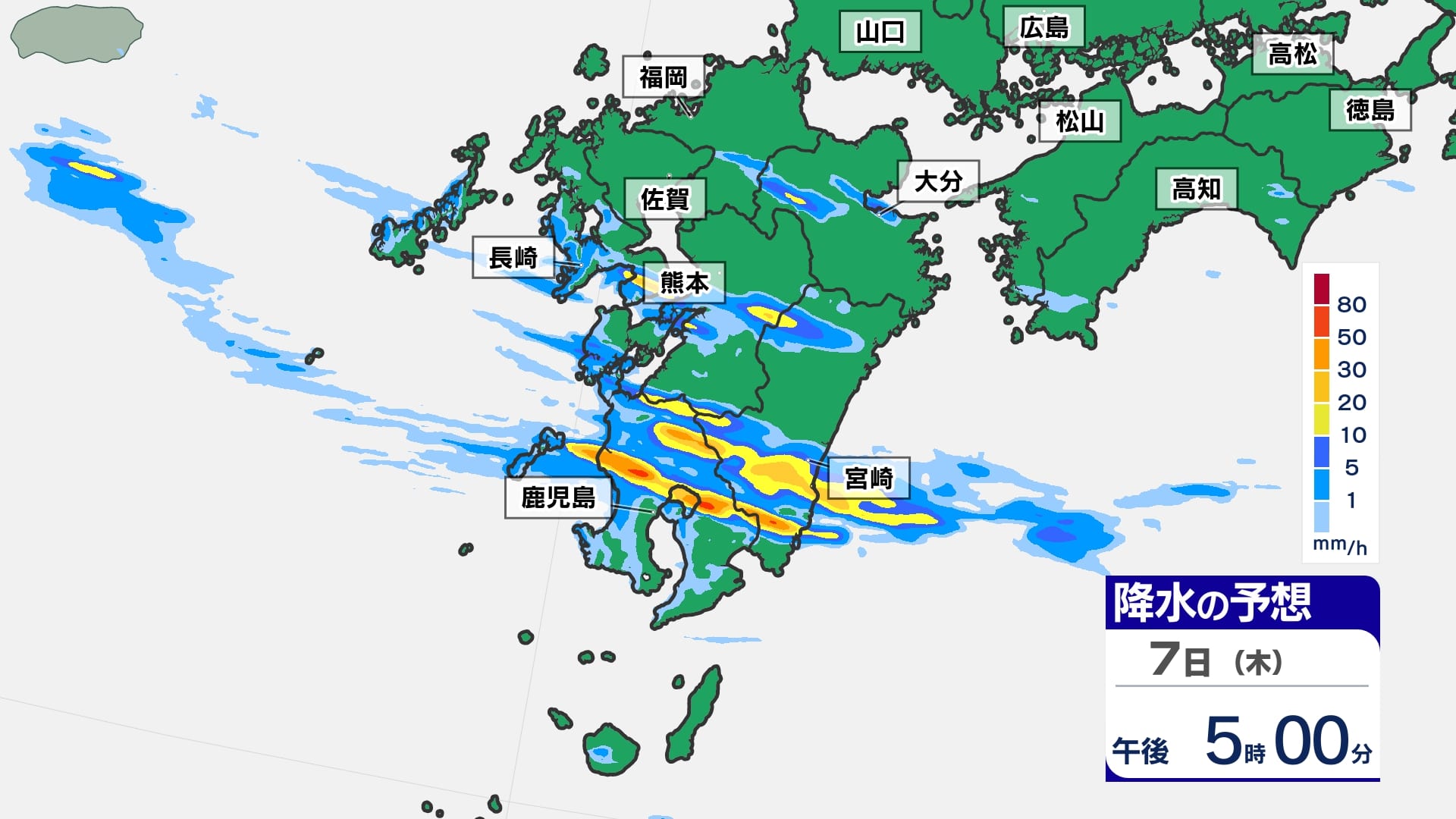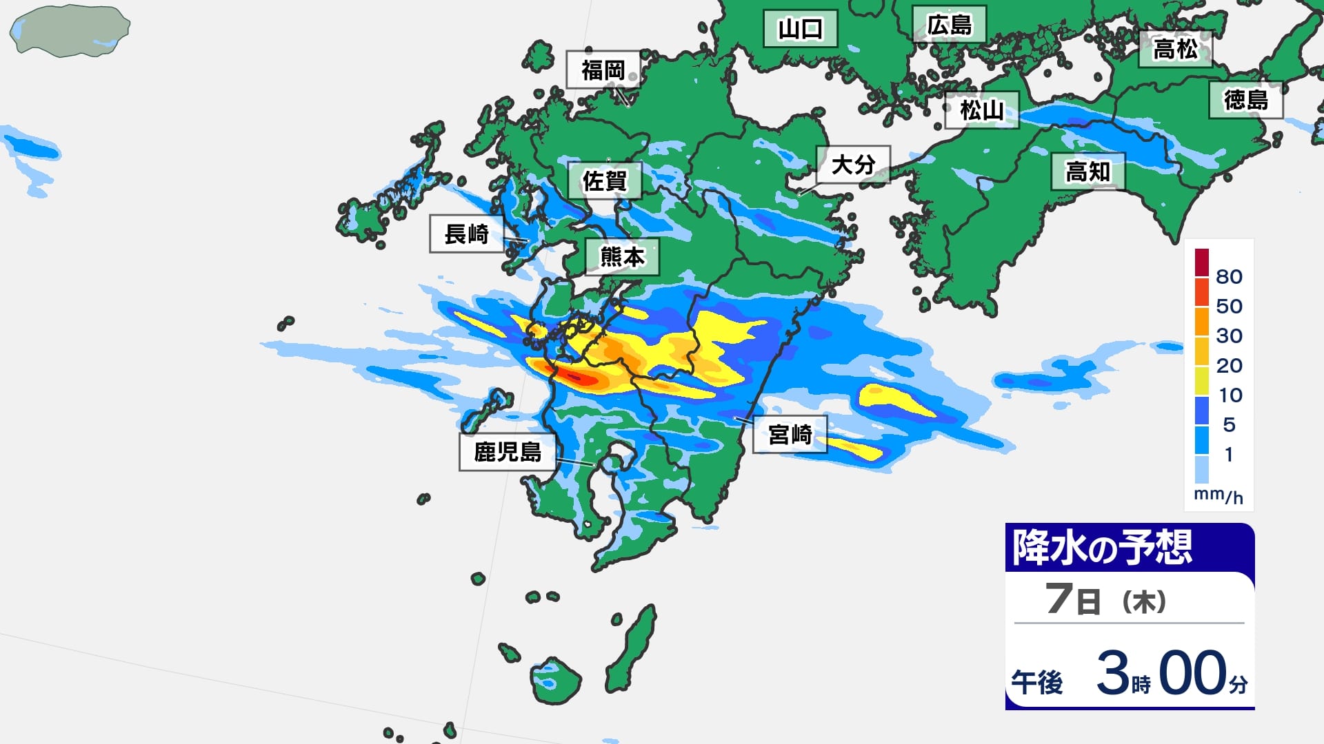 7日(木)活発な雨雲は南下し、8日(金)にかけて雨の中心は熊本県・鹿児島県に移り、8日(金)福岡県の雨は小康状態となるでしょう。9日(土)には雨雲は再び北上し、10日(日)にかけて雨の中心は、福岡県や熊本県に移りそうです。雨のシミュレーションは画像で確認できます。