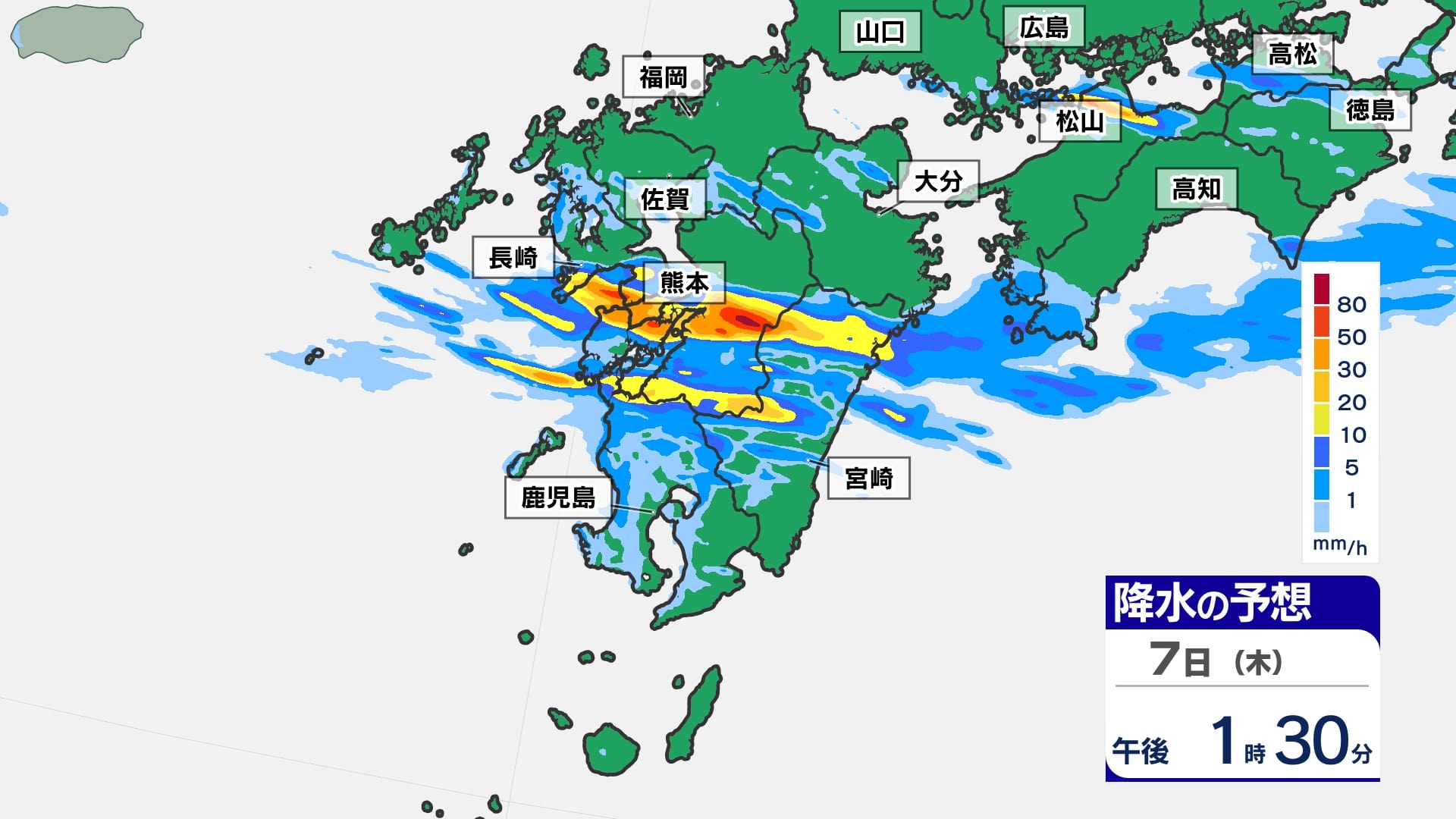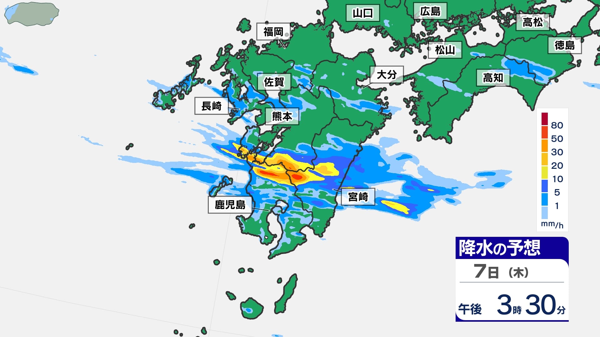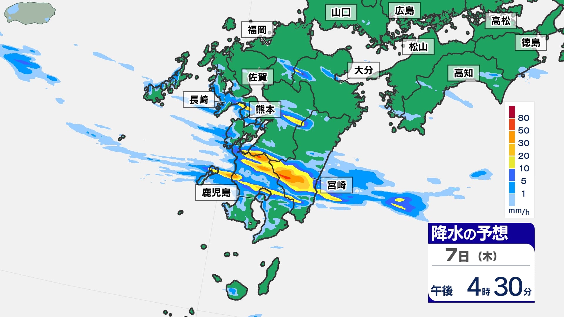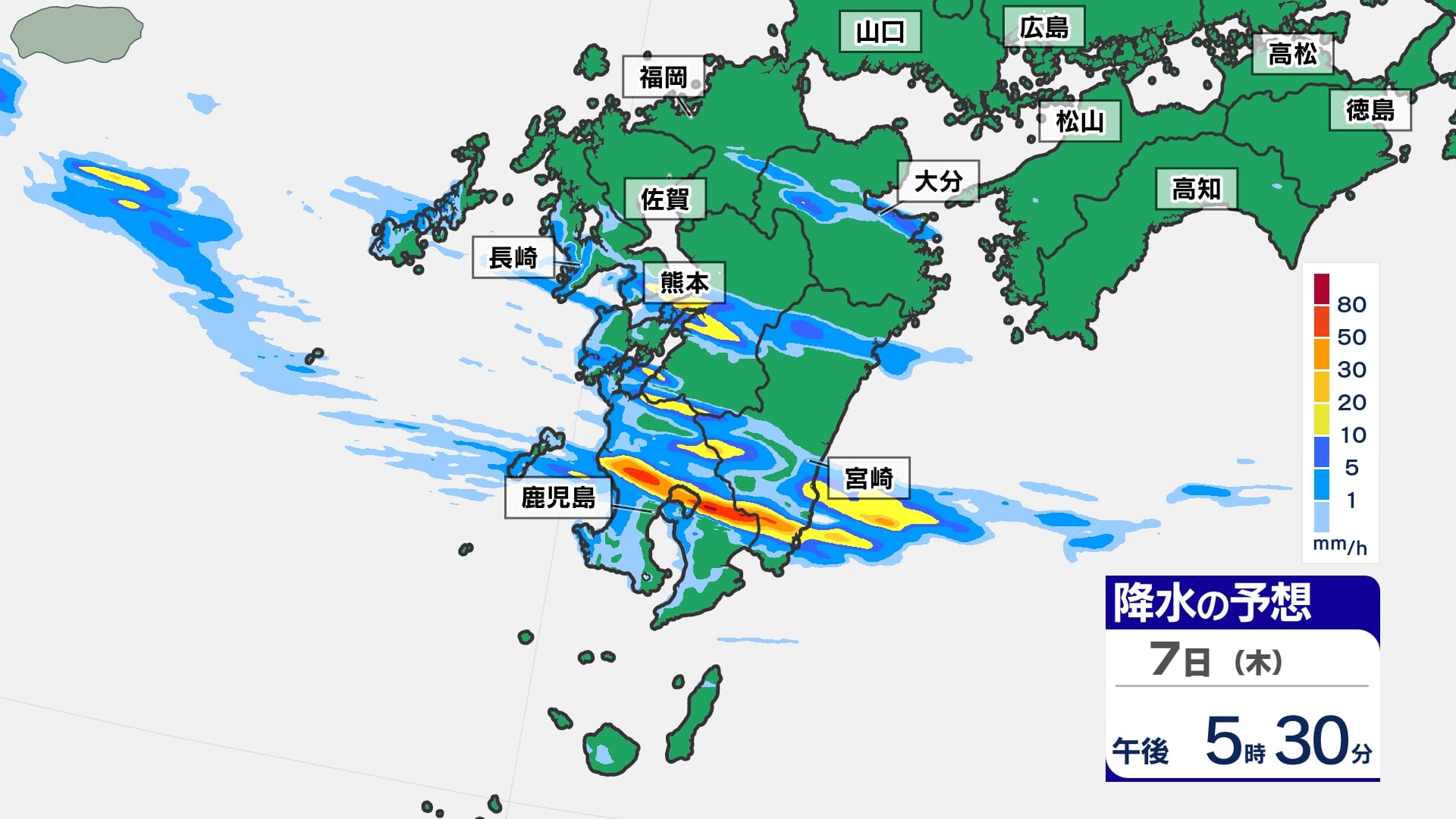 7日(木)活発な雨雲は南下し、8日(金)にかけて雨の中心は熊本県・鹿児島県に移り、8日(金)福岡県の雨は小康状態となるでしょう。9日(土)には雨雲は再び北上し、10日(日)にかけて雨の中心は、福岡県や熊本県に移りそうです。雨のシミュレーションは画像で確認できます。