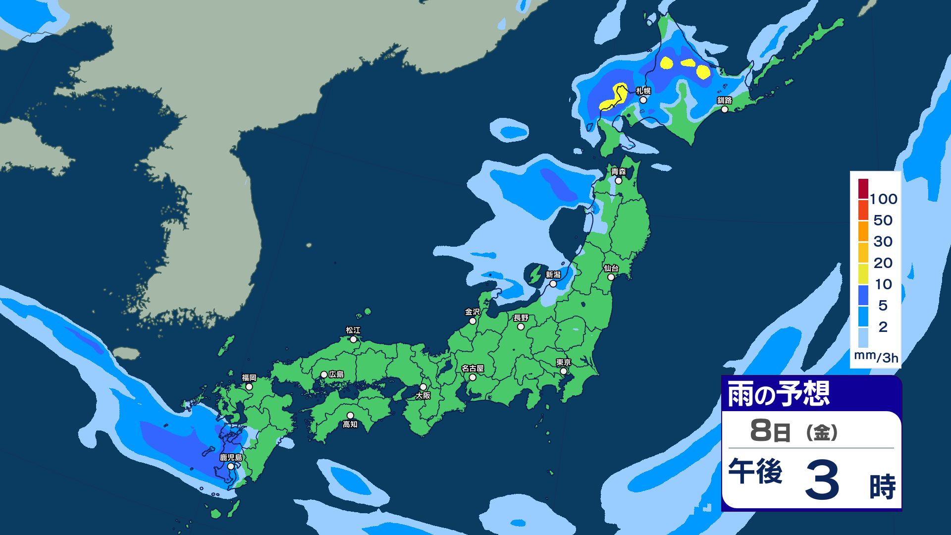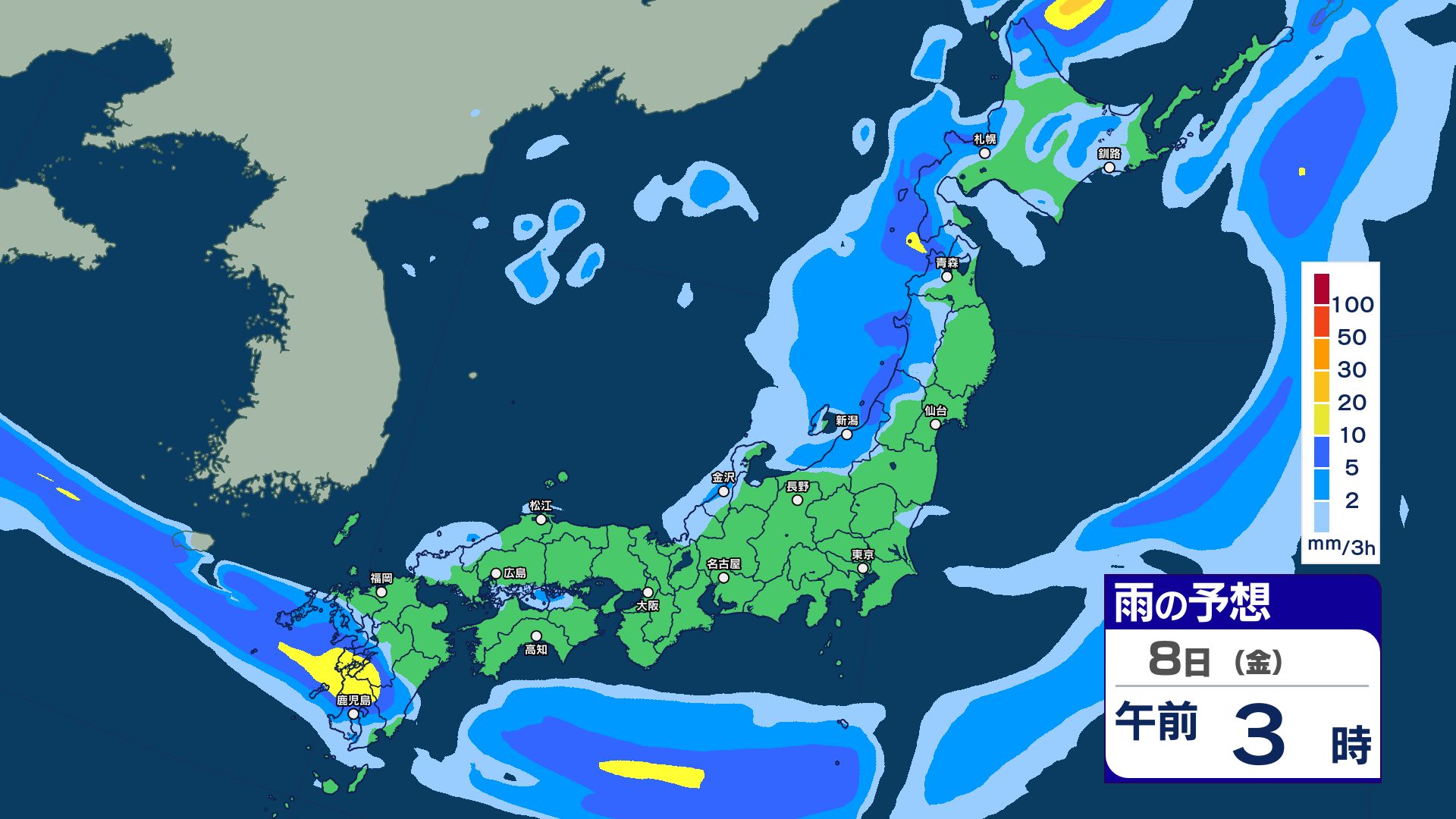 3. 今後の雨はどこで降る?北海道・東北・近畿80ミリ 北陸100ミリ 九州北部150ミリ(~8日正午まで・多い所)【雨のシミュレーション画像】気象庁