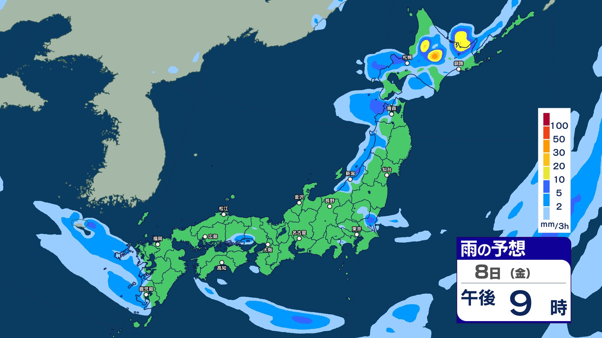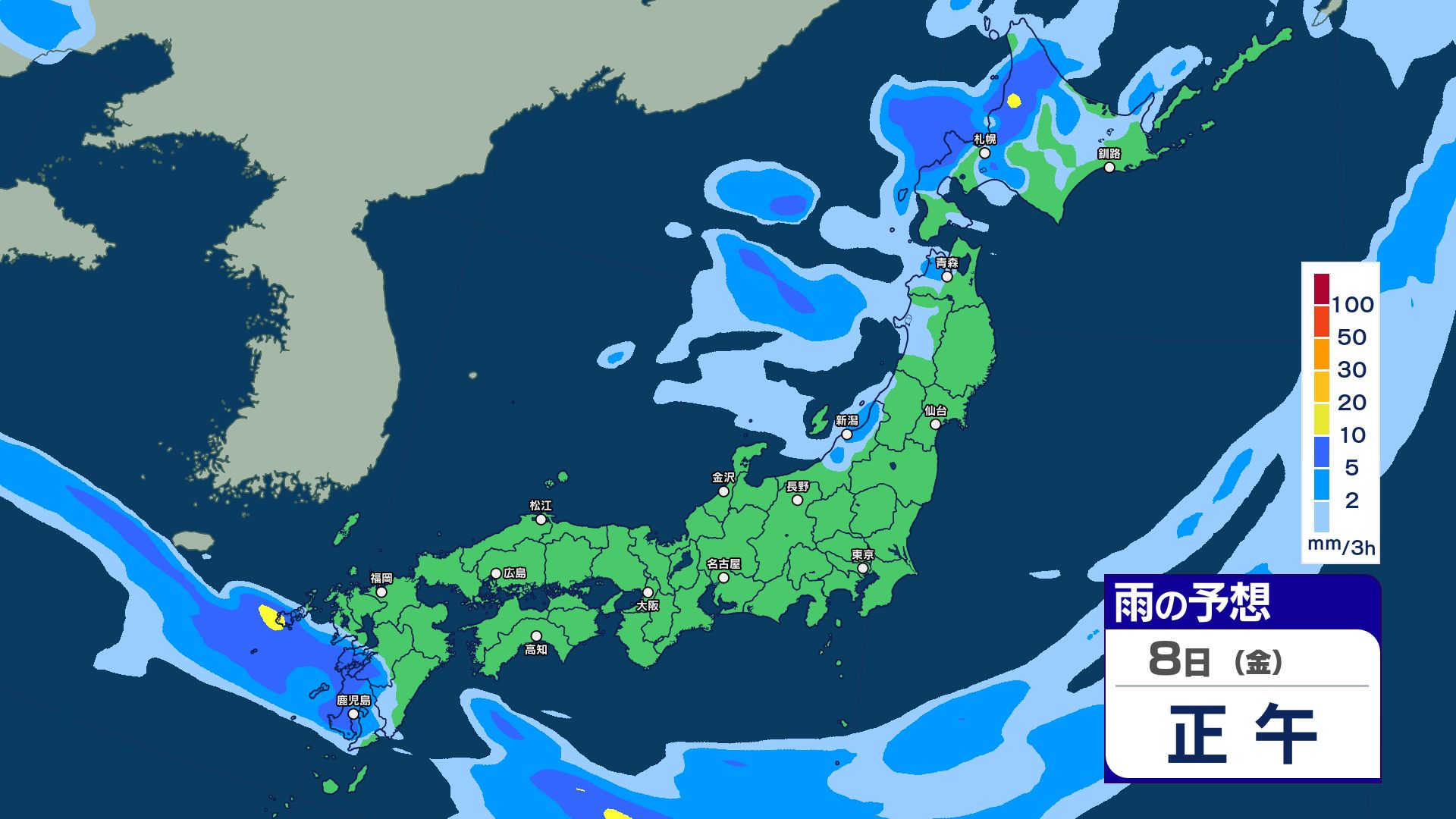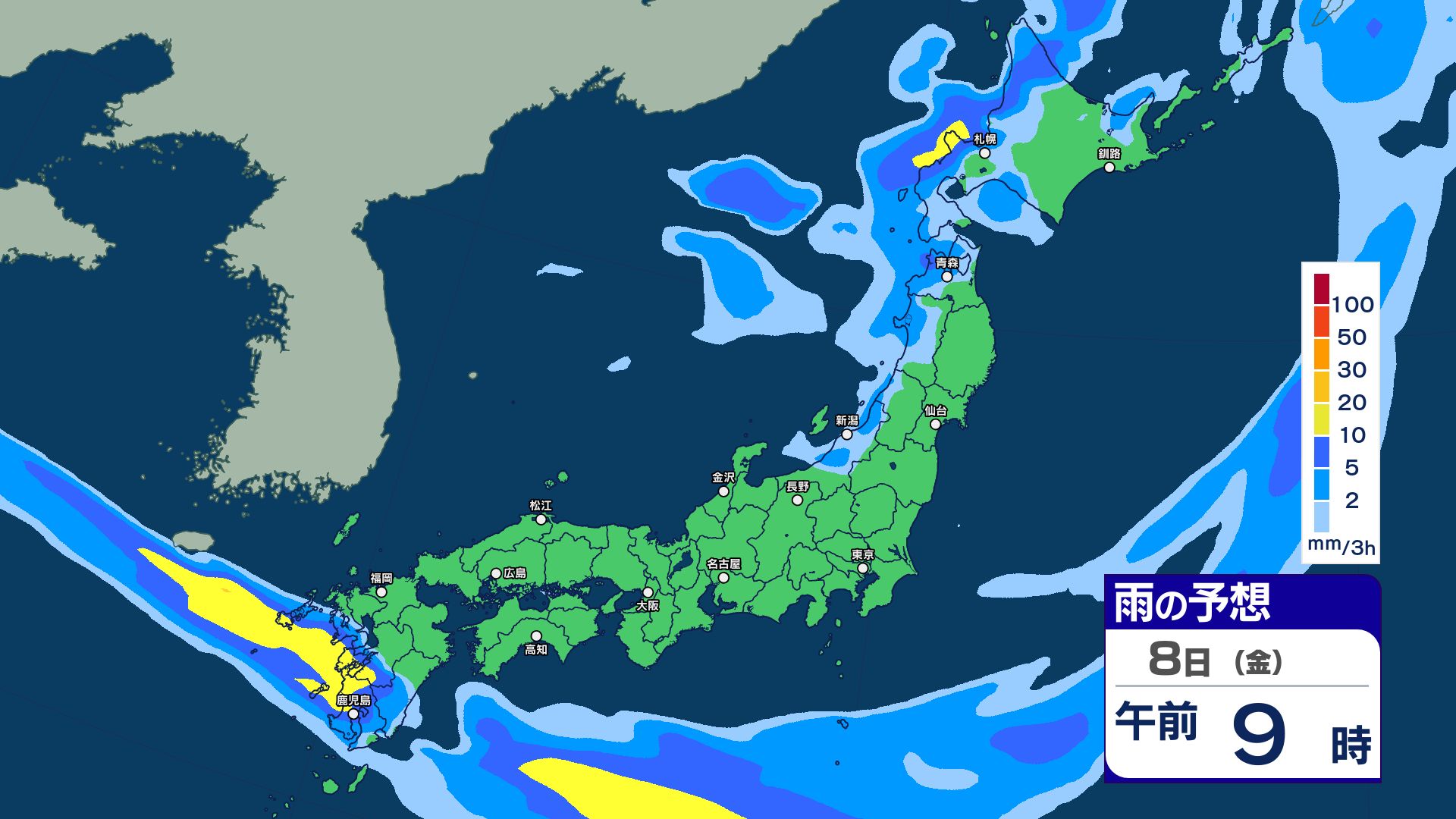 今後の雨はどこで降る?北海道・東北・近畿80ミリ 北陸100ミリ 九州北部150ミリ(~8日正午まで・多い所)【雨のシミュレーション画像】気象庁