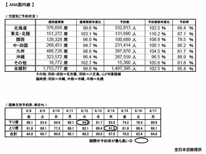 全日本空輸は、お盆期間(8月8日~17日)の予約状況をまとめました。(1日時点)