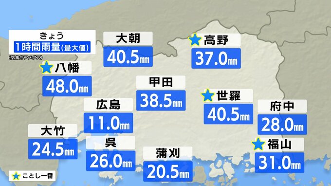 きょう7日(木)の広島県内は、低気圧からのびる寒冷前線が中国地方を南下した影響で、一時的に荒れた天気になりました。局地的に雷を伴い激しい雨が降った地点もあります。特に明け方から朝にかけて、1時間雨量の最大値は、八幡で48ミリ 世羅で40.5ミリ 福山31ミリ 高野37ミリなどとなり、激しい雨を観測しています。また、未明からの降り始めからの総雨量は北部ほど多くなり、県の雨量計では、北広島町(仁川)110ミリ 三次市作木町120ミリを記録しています。