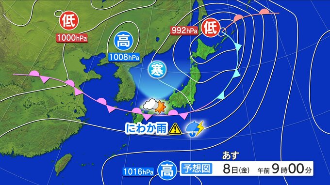 南下した前線は本州の南岸に停滞し、あすは大陸の高気圧にゆるやかに覆われて晴れ間がある予想です。ただ、引き続き湿った空気が入りやすく、加えて上空には寒気も入るため、あすの夜のはじめ頃にかけて引き続き大気の状態が非常に不安定になります。広範囲でにわか雨の可能性があり、局地的に雷を伴う所がある見込みです。日差しが届いていても、空模様の急な変化にはご注意ください。