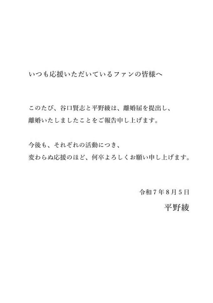 このたび、谷口賢志と平野綾は、離婚届を提出し、離婚いたしましたことをご報告申し上げます。