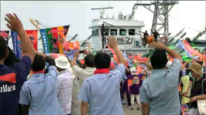 岸壁には市民や乗組員の家族、約1000人が集まり航海の安全と大漁を願いながら、打ち囃子とともに5色の紙テープをつなぎ船を見送りました。