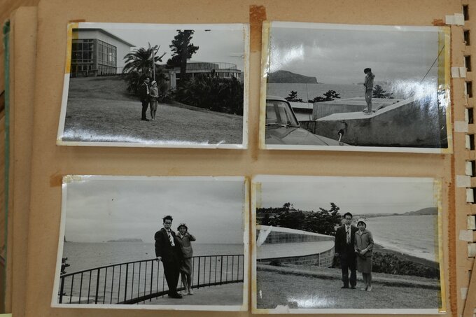 中に収められた写真には、眼鏡姿の男性と、優しそうな女性が写っている。ホテルらしき建物の前で撮ったものもあれば、水辺で撮ったものもある。長崎鼻灯台などすぐに指宿と分かる場所もあったが、枚数が多い。