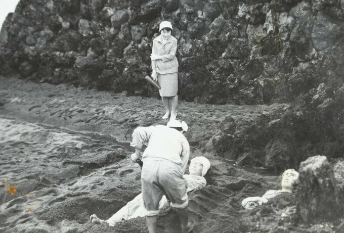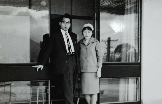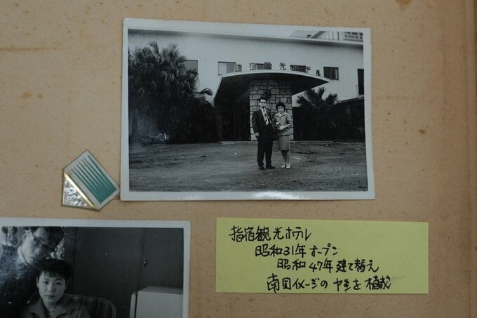 昭和36年ごろ、観光客の増加を受け、指宿市の海岸沿いではホテル・旅館の建設ラッシュを迎えていた。2人が指宿市を訪れたのはまさにその頃。ホテルの正面で2人並んでいる1枚は、指宿観光ホテル(現 指宿いわさきホテル)と分かった。