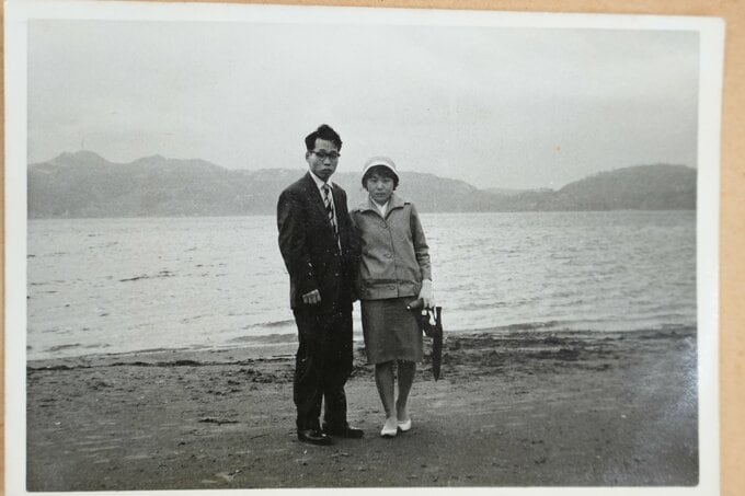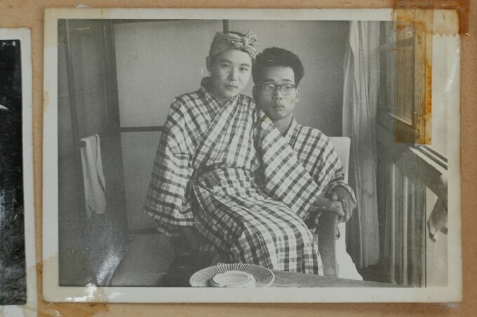 2人ともスーツ姿で、きちんとした格好で旅行する当時の新婚旅行のスタイルだった。宿泊先では浴衣でくつろぐ姿もあった。