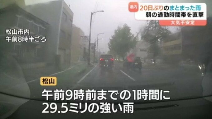 7日の愛媛県内は久しぶりにまとまった雨となり松山では1時間に29.5ミリと通勤通学の時間帯に強い雨を観測しました。県内全域でまとまった雨が降るのは20日ぶりです。7日の県内は前線が西日本を南下し、暖かく…