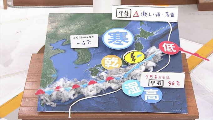 上空にあす冷たい空気=寒気が流れ込んでくる予想となっているんです。上空の気温がマイナス6℃ほどと言われていまして、上空と地上の気温差を足して40度以上だと、天気急変のおそれがあると言われているんですが、42度なんです。