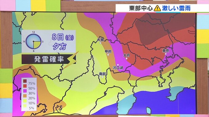 赤色のところは雷が鳴りやすい確率50%以上。この辺りでは特に雷雨となるおそれがありますので、天気の急変、さらに山や川のレジャー計画されてる方も十分な注意が必要となります。