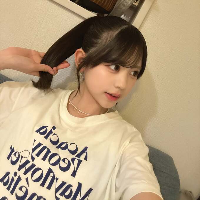 梶原さんは、紺の大きなアルファベットが印象的にプリントされたシンプルな白のTシャツを着て、レンズから目線を逸らしつつ、後ろ髪を持ってみた写真を投稿し「大好きポニーテール」とテキストしています。