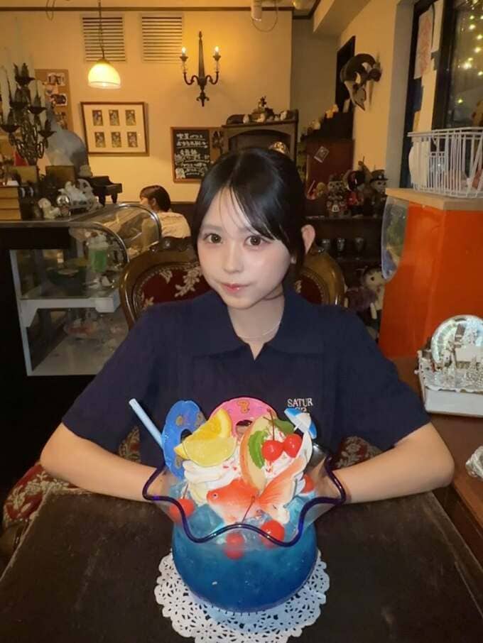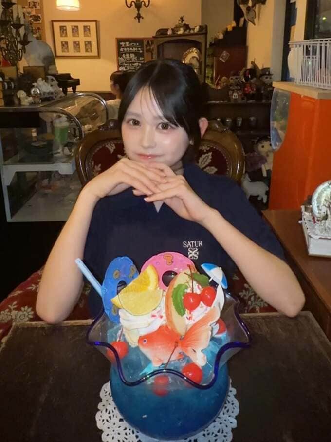 続く投稿で梶原さんは、アンティークの家具や照明がたくさん設けられているお店の中で、木製のテーブルに置かれたパフェのようなグラスを前にして得意気に微笑んでいる写真を投稿。ここは表参道にある “レトロ” な雰囲気で人気を集めている喫茶店とのことで、梶原さんの前にあるものはパフェではなく「クリームソーダ」とのことです。