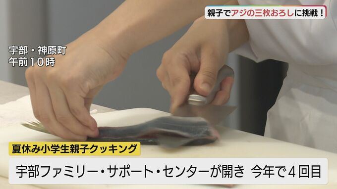 山口県宇部市で小学生を対象にした料理教室が開かれ、親子がアジの三枚おろしに挑戦しました。