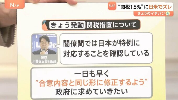 日本時間7日午後1時1分、アメリカ・トランプ政権による「相互関税」の新たな税率が発動されました。しかし、日米で合意した内容に認識のズレが生じています。