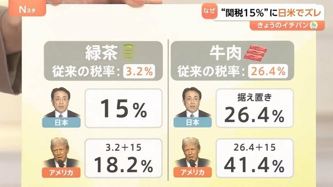 具体的にいうと、たとえば緑茶は従来の税率が3.2%です。日本はこれが15%に引き上げられると思っていましたが、アメリカの考えでは、3.2+15で18.2%になります。