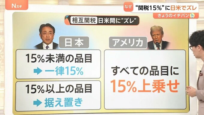 相互関税における日米間の“ズレ”をみていきます。日本としては、今15%未満の品目については一律15%に引き上げ、15%以上の品目については据え置き、全体的に一律15%の関税になるという認識でした。