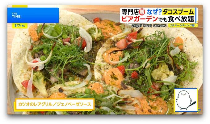 ▼牛肉とトマトで煮込んだ豆をトッピングした「白インゲンのトマト煮込み/パンチェッタ」や、▼香ばしく炙ったカツオに、香草や季節の野菜たっぷりの「カツオのレアグリル/ジェノベーゼソース」など、珍しくも夏らしい絶品タコス6種類を日替わりで味わえます。