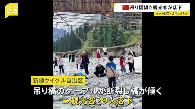 中国国営メディアによりますと、6日、新疆ウイグル自治区の観光地で、つり橋を支えていたケーブルが突然、断裂して橋が傾き、観光客ら29人が落下しました。この事故で5人が死亡、2人が重傷を負い、22人が軽いけが…