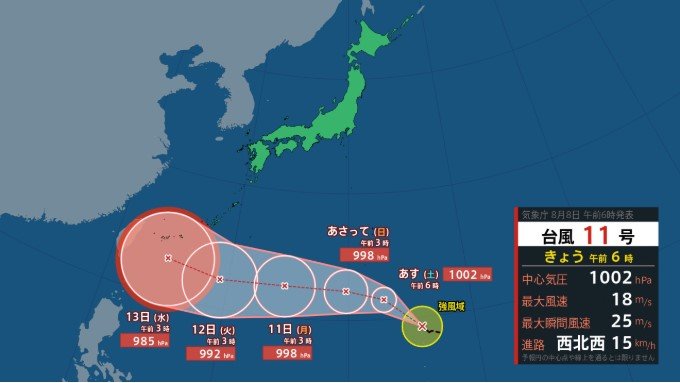 気象庁によりますと、8日午前3時、マリアナ諸島において、熱帯低気圧が台風11号になりました。台風は1時間におよそ15キロの速さで西へ進んでいます。中心の気圧は1002ヘクトパスカル、中心付近の最大風速は18メートル、最大瞬間風速は25メートルで中心から半径165キロ以内では風速15メートル以上の強い風が吹いています。