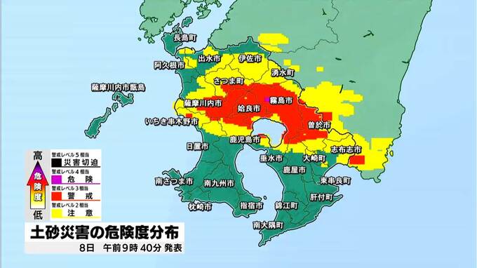 土砂災害の危険度分布です。この時間は赤の表示、警戒が薩摩・大隅地方北部の広い範囲にあります。特別警報の出ていないところでも、土砂災害には厳重な警戒が必要です。崖など危険な場所からは離れてください。