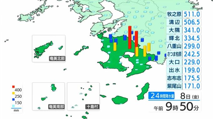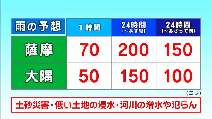 では雨の量の予想です。薩摩大隅地方で予想される雨の量は多いところで、1時間に50ミリから70ミリ。9日朝までの24時間には150ミリから200ミリ。その後、10日朝までの24時間には100ミリから150ミリです。