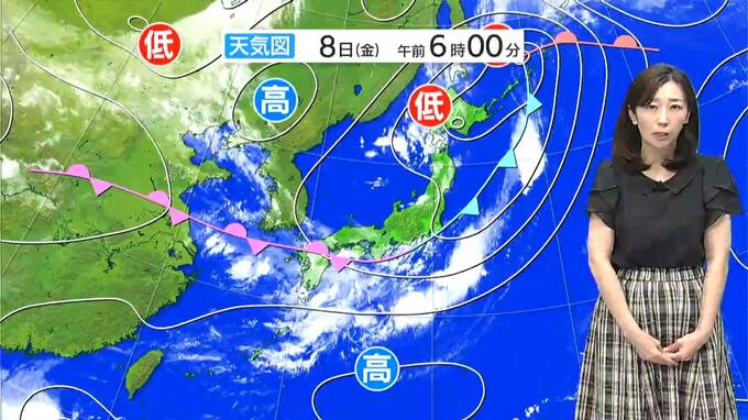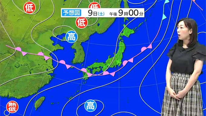 そして、9日の予想天気図です。9日の夜を見ますと、このように前線の位置が9日にかけてほとんど変わらず、しかも前線の活動は活発です。