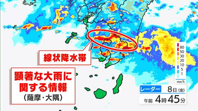 大雨をもたらした線状降水帯はきょう8日未明から明け方に薩摩・大隅地方の北部に発生しました。非常に激しい雨が同じ場所で降り続きました。