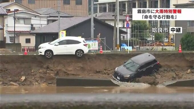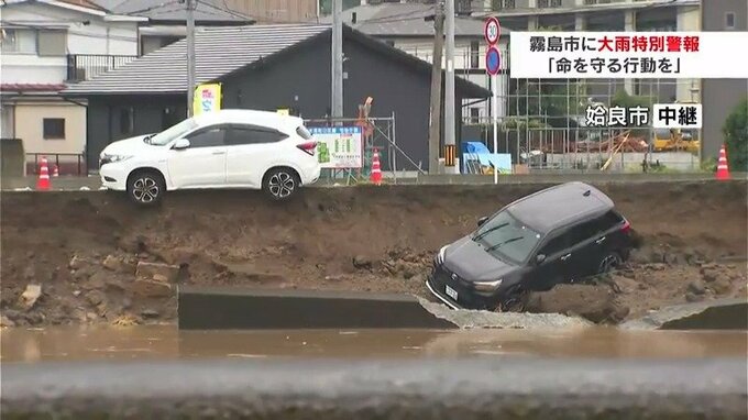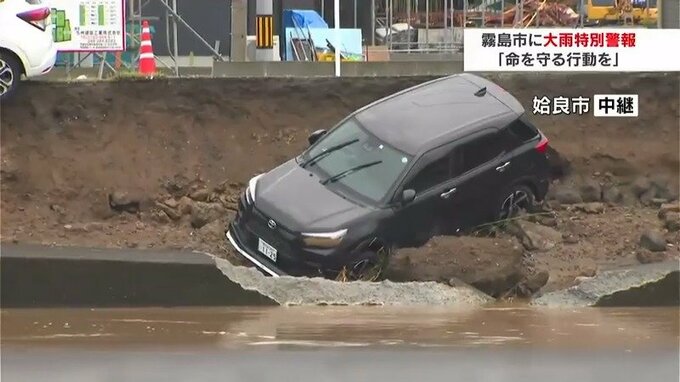 姶良市加治木町を流れる網掛川護岸が崩れた現場では、車が2台落ちていて、その横、電柱も傾いています。